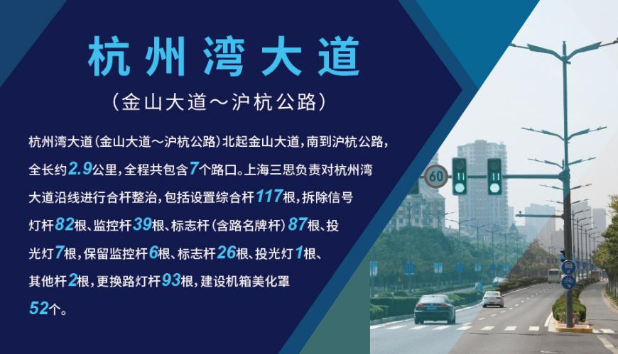 期間,上海三思積極配合金山政府進行整改活動,實現對杭州灣大道(金山大道?滬杭公路)道路設施合桿整治,按照多桿合一、多箱合一的要求,對各類桿件、機箱、桿上設施、配套管線等進行集約化設置,實現共建共享,互聯互通,多效一體化設計,合桿率大于50%。