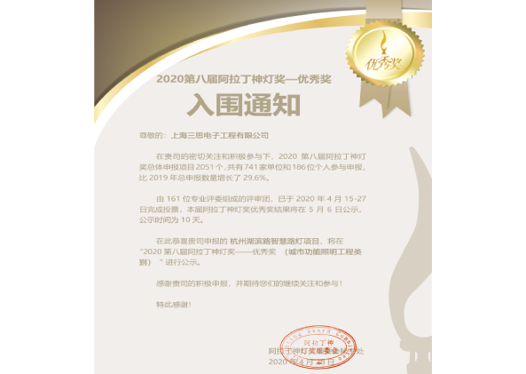 第八屆阿拉丁神燈獎評選在4月末正式拉下帷幕,上海三思憑借杭州湖濱路智慧路燈項目入圍“優秀工程獎”,這是上海三思2020年以來智慧燈桿榮獲的重要獎項之一。