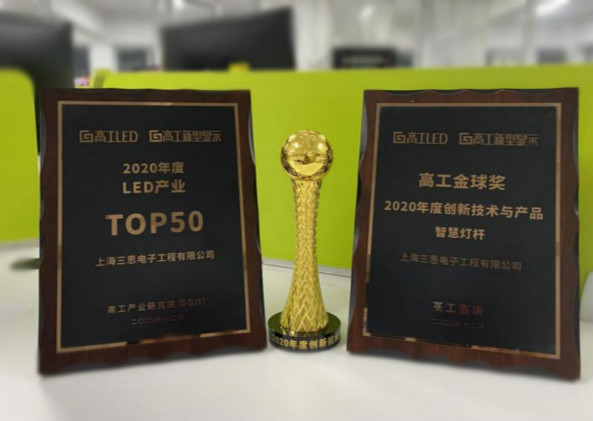 12月15日,2020高工LED年會暨高工金球獎頒獎典禮在深圳隆重舉行,作為LED行業極具公信力、影響力和權威性的評選,上海三思憑借雄厚的技術實力和過硬的產品質量,一舉榮獲兩大獎項——“2020年度創新技術與產品——智慧燈桿”和“2020年度LED產業top50”。